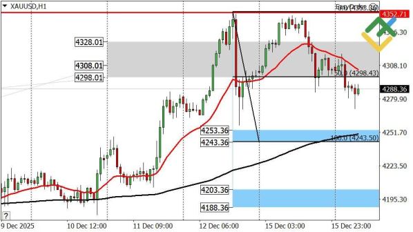 Золото вчера не смогло обновить локальный максимум и развернулось вниз, вернувшись в Целевую зону 4328–4298. Сейчас цена приближается к зоне поддержки 4253–4243, которая ранее уже выступала как уровень отскока. С учётом текущей рыночной структуры, здесь высока вероятность формирования бычьей реакции.