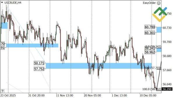 В ближайшей перспективе возможна краткосрочная коррекция вверх. На уровне 59.24–58.96 сформирована зона сопротивления A, от которой трейдеры могут искать сигналы на открытие коротких позиций. После подтверждения разворота — например, формирования паттерна «медвежий поглощающий» или закрытия свечи под уровнем — можно рассматривать продажу.