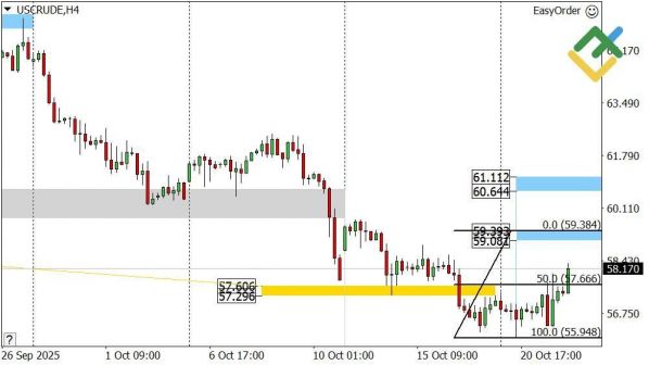 На текущий момент цена на нефть демонстрирует восходящую коррекцию в рамках общего краткосрочного нисходящего тренда. Котировки приближаются к зоне сопротивления 59.39–59.08 — критическому уровню, который может стать отправной точкой для новых продаж.