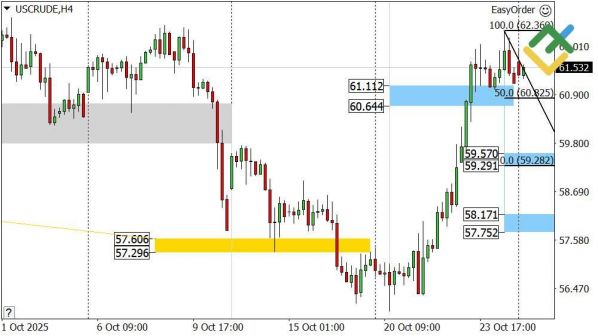 На неделе цена на нефть преодолела ключевой уровень сопротивления в диапазоне 60.64–61.11, что стало сигналом смены краткосрочного тренда с нисходящего на восходящий. Это не просто локальный отскок — пробой подтверждён объёмами и закреплением выше границы предыдущего канала.