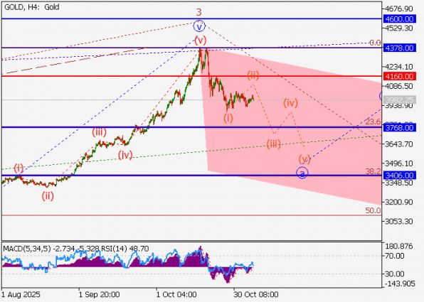 Эта сложная структура говорит о высокой вероятности продолжения нисходящего движения. Если текущая разметка верна, то следующей целью для пары XAU/USD станет ценовой коридор 3768.00 – 3406.00. Важно подчеркнуть, что данный сценарий теряет актуальность только в случае преодоления и закрепления цены выше критического уровня 4160.00. Этот уровень выступает своего рода «линией фронта» между быками и медведями.