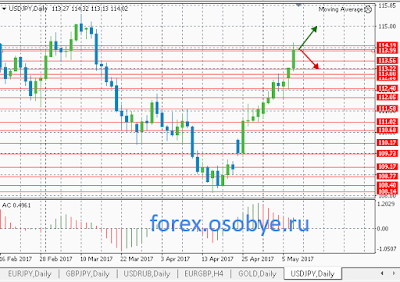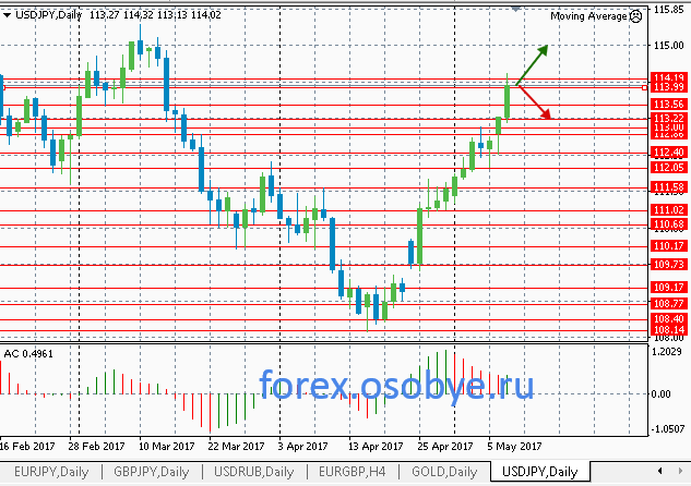 Игрокам форекс по доллару с иеной сегодня 10 мая стоит ждать продолжения роста от коррекции к поддержке 114.00 - 113.80, с целью 114.80 - 115.00. Альтернатива по USD/JPY: пробой и закрепление курса ниже 114.00 - 113.80, даст возможность котировкам скорректироваться ниже к 113.50 - 113.00