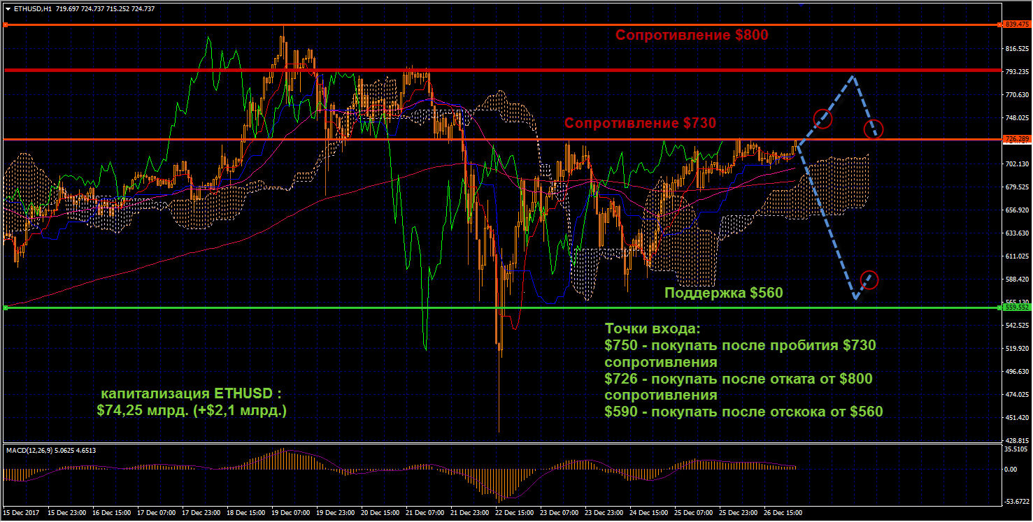 Технический анализ и прогноз ETHUSD: ETHUSD сегодня показывает более высокий уровень волатильности, по сравнению с предыдущей торговой сессией. Цена Эфириума вплотную подбирается к $730 сопротивлению на данный момент, готовимся в скором времени открывать ордер на покупку от $745. MACD и Ишимоку указывают на восходящую тенденцию. Ключевым диапазоном сопротивления, помимо текущих на данный момент является $730-$793, но не стоит опасаться краткосрочной коррекции в случае достижения уровнем цен этого диапазона. Мы бы наоборот рассмотрели этот как возможность нарастить длинные позиции по более выгодной цене. От коротких позиций, по ясным причинам, пока отказываемся.