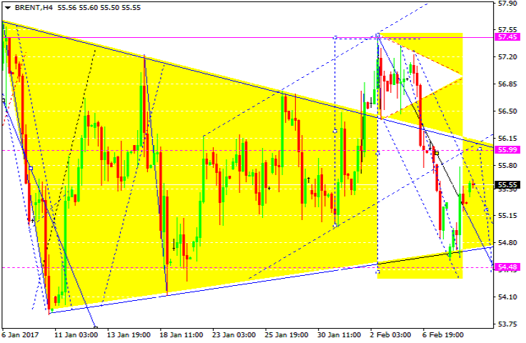 Нефть торгуется в коррекционной волне к уровню 54.48. На сегодня рассмотрим составную часть этой волны с возвратом к уровню 55.99 как четвёртую. Далее ожидаем пятую, на отработку уровня 54.48.
