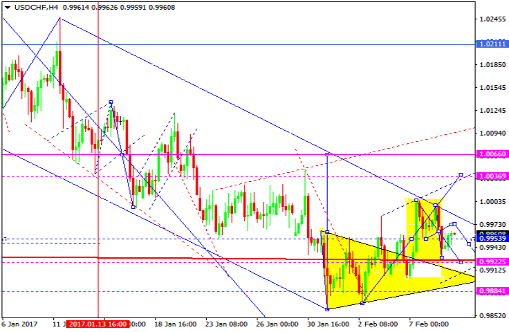 Валютная пара доллар франк торгуется в коррекции. На сегодня рассмотрим возможность снижения как пятой в коррекции к уровню 0.9922. Далее - рост к 1.0036. Затем - снижение к уровню 0.9955.