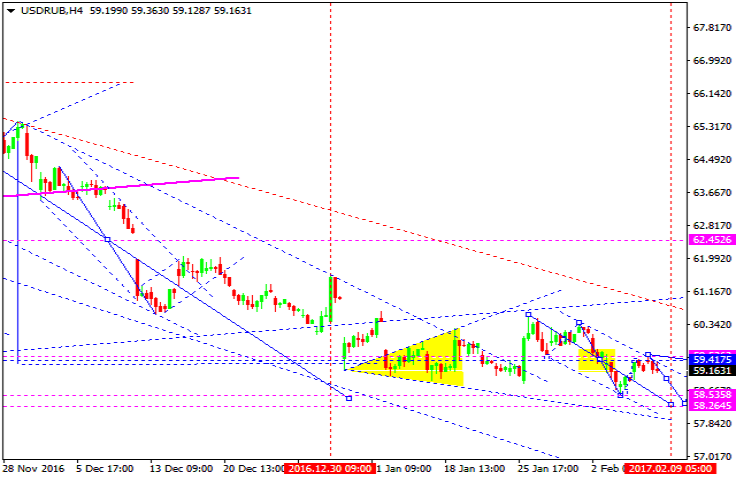 Валютная пара доллар США к российскому рублю торгуется на отбой от уровня 58.55 вверх. На сегодня рассмотрим возможность коррекции к 59.42. Далее - снижение к уровню 58.27