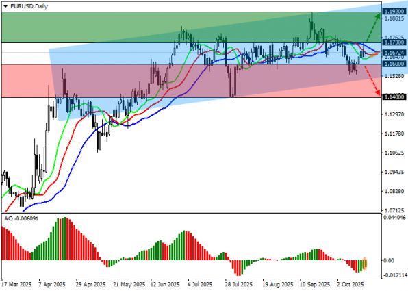 На дневном графике EUR/USD торгуется вблизи 1,1672, находясь в восходящем канале с границами 1,1500–1,2000. Однако цена сейчас тестирует нижнюю границу, что создаёт неоднозначную картину.