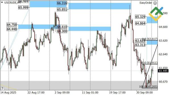 На прошлой неделе по нефти была достигнута нижняя целевая зона 60.70–59.77, где закрылись крупные шорты. После этого началась восходящая коррекция.