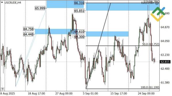 - Нефть (US Crude): формируется нисходящий импульс после тестирования сопротивления.