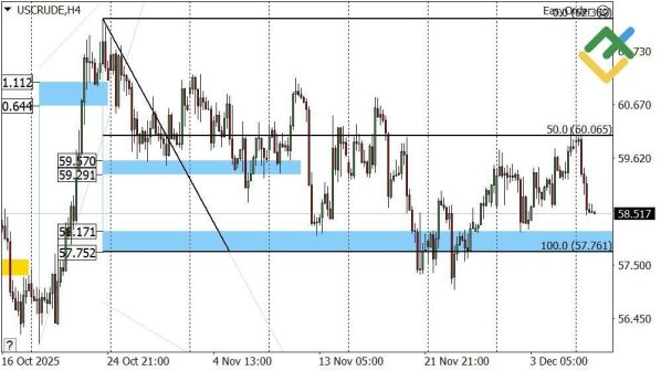 Нефть марки WTI (USCrude): После локального отскока котировки вновь тестируют важную область поддержки в диапазоне 58.17 – 57.75. Удержание этого уровня покупателями будет определять дальнейшее направление тренда.