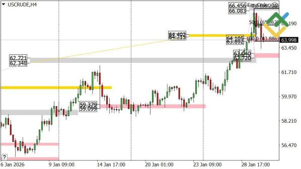 При сохранении поддержки в указанном диапазоне формируется благоприятный сценарий для покупок. Первая цель локального отскока расположена на уровне 65.06, вторая — в районе 66.23. Ключевой уровень защиты восходящего импульса смещен на 63.04–62.72. Пробой ниже этой границы отменит бычий сценарий и откроет путь к тестированию зоны 61.50.