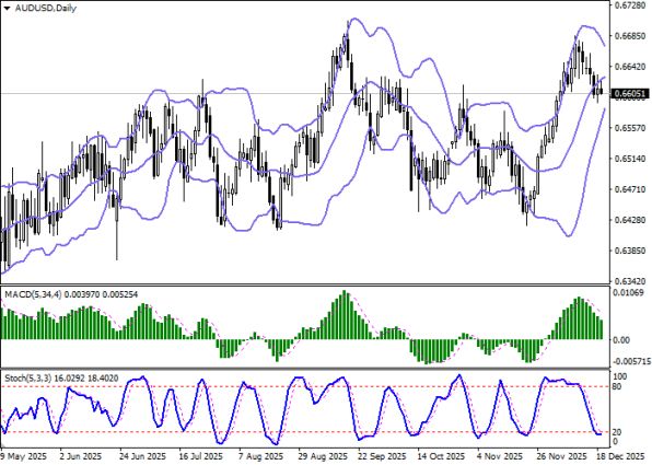 AUD/USD торгуется вблизи ключевой зоны 0.6600, где сочетаются фундаментальное давление со стороны статистики Австралии и США и технические сигналы на усиление нисходящего движения.