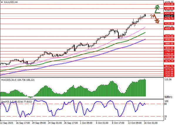 На 16 октября 2025 года золото находится на перепутье: либо пробой к новым максимумам (4300–4400), либо временная консолидация с последующим возобновлением роста.