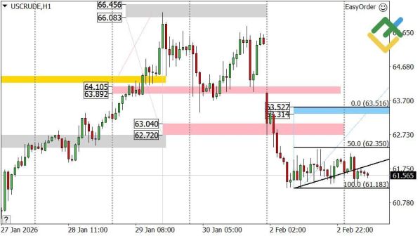 Торговый сигнал по нефти: продажа в районе 63.40–63.35 с защитой стоп-лоссом выше 64.05. Фиксация прибыли на уровнях 62.35 и 61.18.