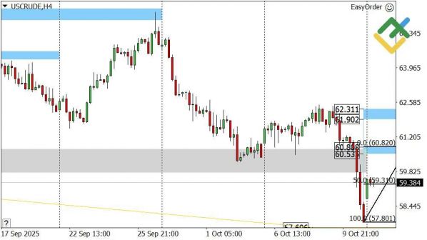 Текущая ситуация: На прошлой неделе цена пробила важную целевую зону в районе $60.70 - $59.77, подтвердив силу "медведей". Однако после резкого движения неизбежна коррекция, которую мы и наблюдаем .
