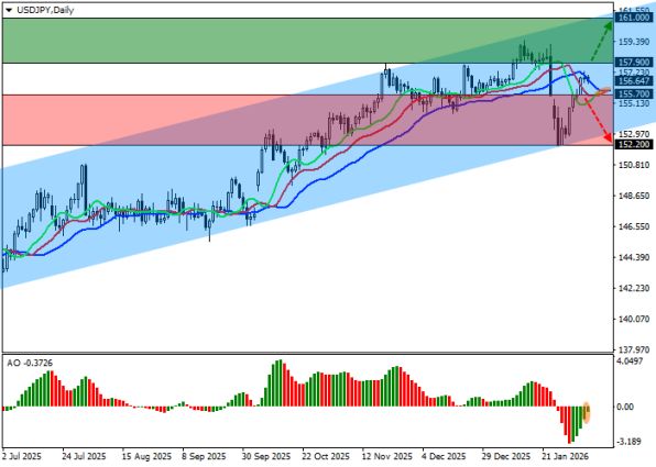 Технический анализ пары USD/JPY подтверждает сохранение восходящего тренда в среднесрочной перспективе. На дневном графике цена корректируется внутри восходящего канала с границами 153.00–161.00, приближаясь к верхней границе. Индикатор «Аллигатор» демонстрирует расхождение быстрых экспоненциальных скользящих средних от сигнальной линии вверх, формируя сигнал к продолжению роста. Гистограмма Awesome Oscillator (АО) формирует коррекционные бары в отрицательной зоне, что типично для здоровой откатной фазы в рамках тренда.