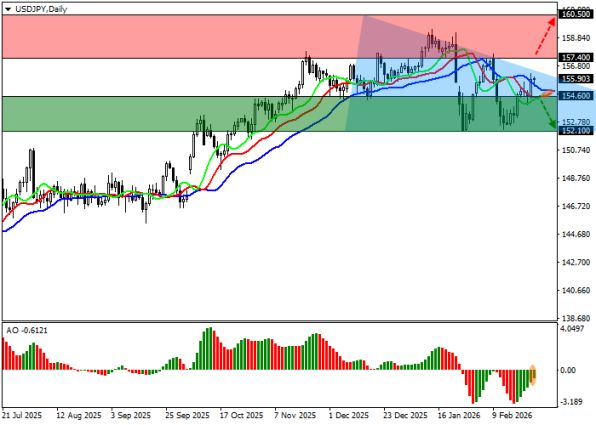 На дневном графике USD/JPY формирует консолидацию в рамках паттерна «симметричный треугольник» с границами 152.00–156.00. Быстрые EMA индикатора «Аллигатор» сближаются с сигнальной линией, а гистограмма Awesome Oscillator показывает коррекционные бары ниже нулевой отметки — сигнал к ослаблению медвежьего импульса.