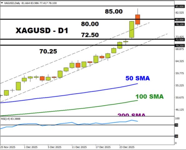 Несмотря на мощный фундаментальный фон, индикатор RSI на дневном графике XAGUSD указывает на сильную перекупленность. Это делает актив уязвимым к краткосрочным откатам, особенно в условиях низкой ликвидности в предновогодний период.