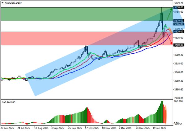 Золото в паре XAU/USD торгуется немного выше ключевой опорной зоны текущего года в районе 4700, оставаясь внутри среднесрочного восходящего тренда после обновления исторического максимума в области 5590 за тройскую унцию. Резкая коррекция, последовавшая за обновлением рекордов, стала следствием агрессивного закрытия перегруженных маржинальных позиций и частичной фиксации прибыли по длинным спекулятивным сделкам в драгоценных металлах.