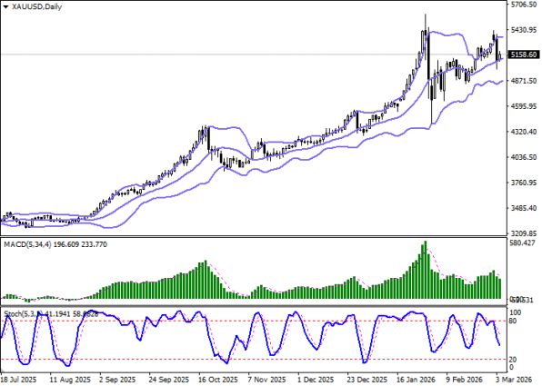 На дневном графике XAU/USD полосы Боллинджера демонстрируют умеренный восходящий наклон при одновременном сужении ценового диапазона, что указывает на смешанный характер торгов и потенциальное накопление энергии для нового импульса. Индикатор MACD развернулся вниз и сформировал подтверждённый сигнал на продажу, поскольку гистограмма опустилась ниже сигнальной линии, а стохастический осциллятор приближается к зоне 20 пунктов, указывая на риск перепроданности золота в сверхкраткосрочной перспективе.