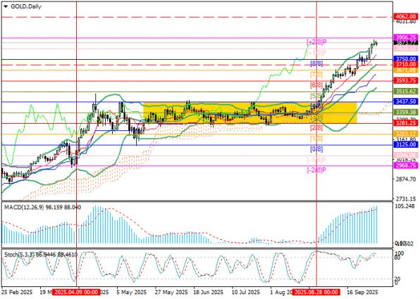 На этом фоне золото укрепляет свои позиции как надёжный актив. Котировки уже приблизились к историческому максимуму — 3870.00, а пробой отметки 3906.25 (уровень Мюррея [+2/8]) может открыть путь к цели 4062.00.