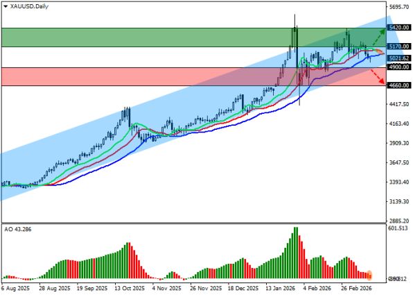 На дневном графике торговый инструмент корректируется выше линии поддержки восходящего канала с динамическими границами 5600.0–4900.0. Долгосрочная бычья структура сохраняется, пока цена удерживается выше ключевой зоны $4,986–$5,000 . После утреннего падения до $4967 золото быстро вернулось выше $5000, что указывает на наличие сильного спроса в этом районе .