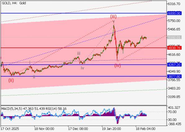 Золото XAU/USD на 27 февраля 2026 года удерживается около 5194 USD за унцию, подтверждая устойчивость восходящего тренда. На дневном таймфрейме пара формирует третью волну старшего уровня 3 of (5), внутри которой строится v of 3. Это создает основу для дальнейшего импульса вверх.