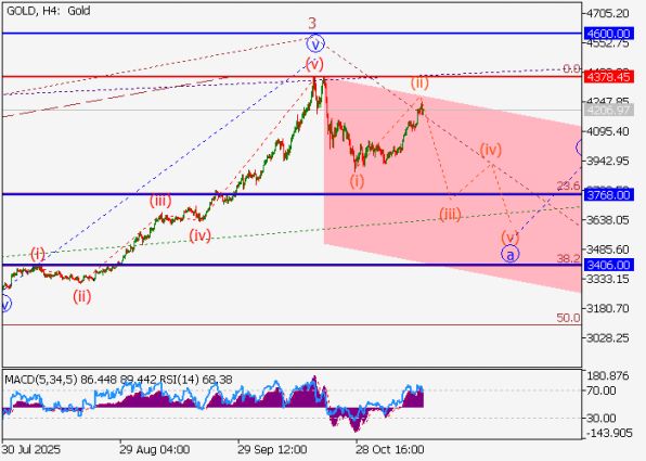 На текущий момент активно развивается внутренняя структура волны a of 4, в составе которой уже завершилась краткосрочная восходящая коррекция — волна (ii) of a. С учётом сложившейся конфигурации, наиболее вероятным сценарием в ближайшие дни выглядит продолжение снижения в рамках волны (iii) of a. Целевые уровни размещаются в диапазоне 3768.00–3406.00, что соответствует как техническим уровням поддержки, так и ключевым фибо-зонам прошлых структур.