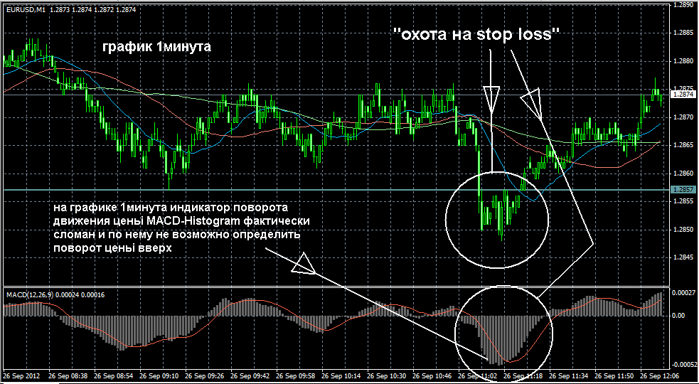 Давайте посмотрим как графически вьіглядел сегодняшний случай, кторьій тоже проводился по чёткой предопределённой схеме. 1) Цена снизилась и чуточку пересекла поддержку SMA(100) графика 4часа. 2) Цена закрепляется под линией поддержки SMA(100) графика 4часа на некоторое продолжительное время. Индикаторьі поворота ценьі MACD-Histogram начинают указьівать на поворот ценьі вверх. И кажется, что отсюда цена должна повернуть и уйти вверх. 3) Цена уходит ещё ниже, ниже сформировавшегося минимума и тем самьім ламает индикатор поворота ценьі MACD-Histogram. И кажется, что цена будет дальше продолжать тренд вниз. Но нет, ето "большие дяди" проводят "охоту на stop loss orders", после которой цена уверенно подьімается по восходящему тренду. Прикрепленные файлы: