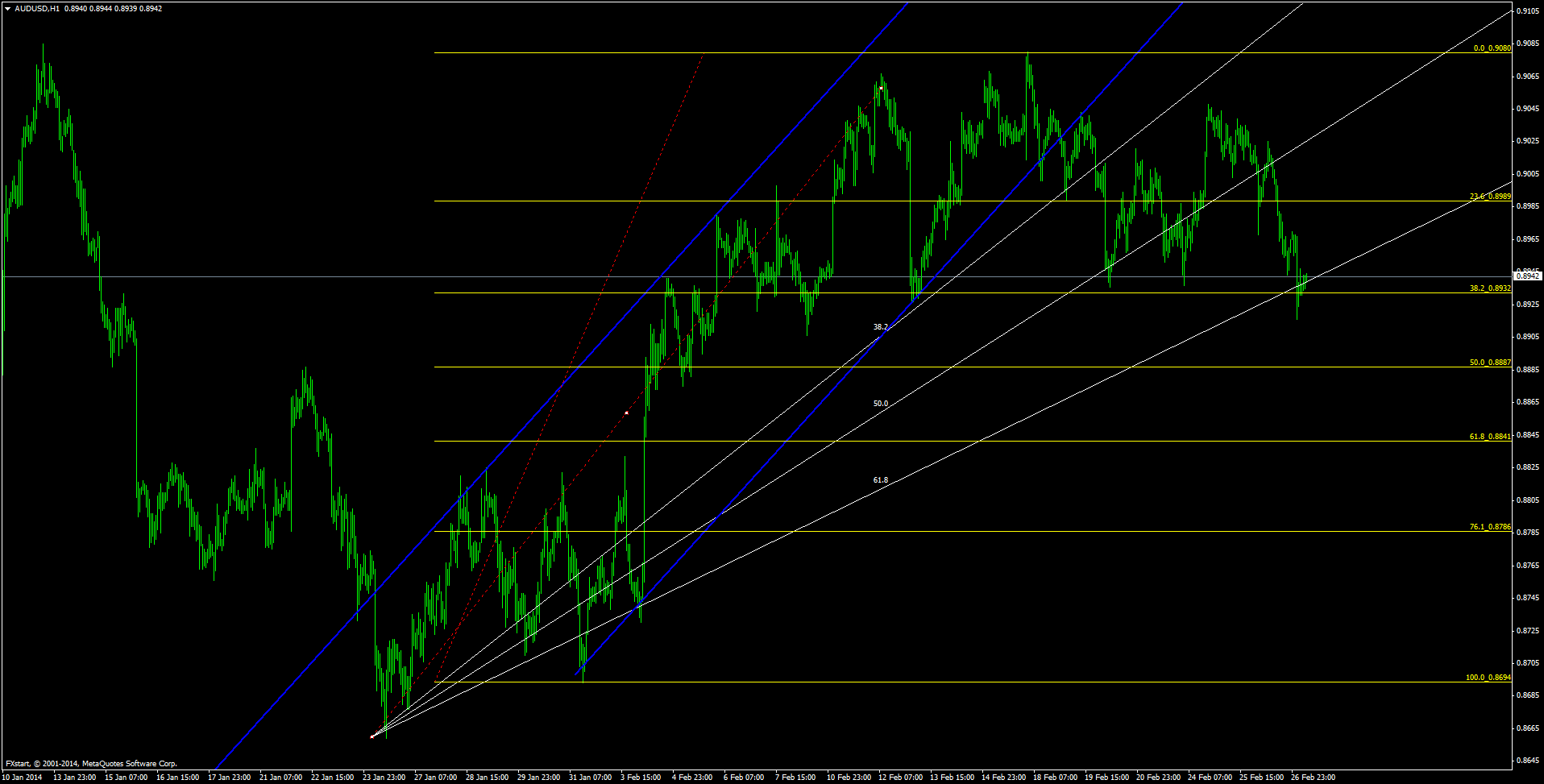 Если новички используют канальную торговую систему, рекомендую входить в позицию на отбой от линии поддержки канала или на отскоке от линии сопротивления канала, но с подтверждением уровня фибо. Хороший пример можно навести по паре новозеландец доллар, где 26 февраля цена отскочила от линии поддержки канала + от 61% фибо от уровня 0.8281 и подошла к линии сопротивления канала (прибыль 83 пункта).