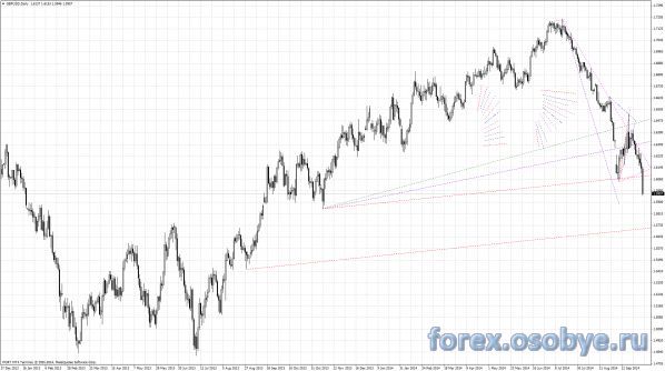 валютная пара фунт/доллар-как видим угол 1/2(розовая линия идущий с вершины) пока держит тренд, цена пробила от угла 1/4(фиолетовая линия) и идет к углу 1/8(красна линия)