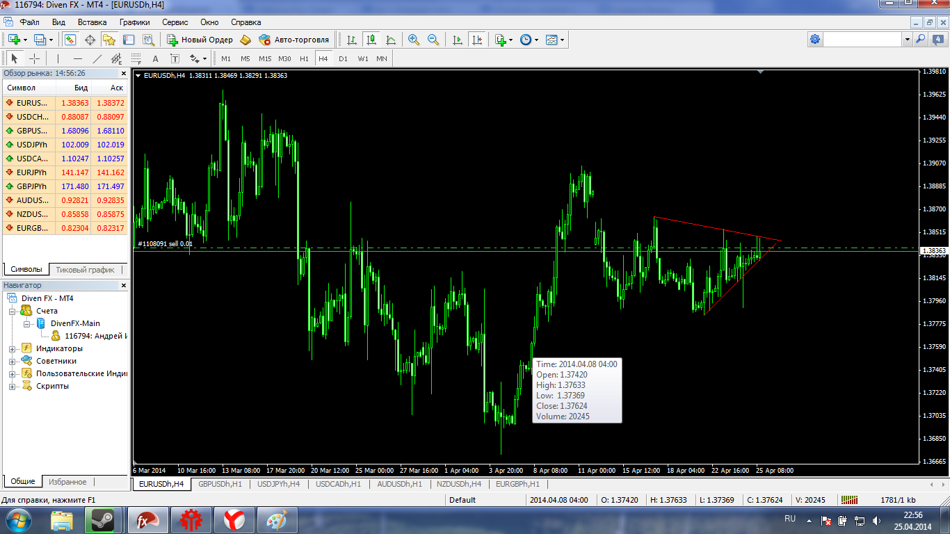 Поглядел сейчас на евробакс и увидел вот такой вот сужающийся треугольник, и выход из него может произойти даже сегодня под конец американской сессии. Думаю напрашивается выход вниз , так как заход был сверху, но посмотри как будет. |