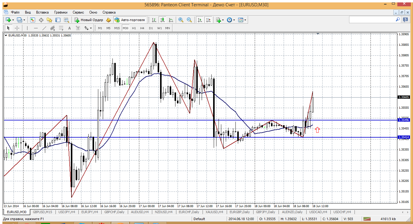 Н4. Так и на этом ТФ тоже картина движения цены на север. Самый простой и довольно надежный подход: смотрим зиг - заг, то видим что и вершины (1 и 3) и низинки (2 и 4) последоватеьно растущие. Да и цена вроде выше мувинга уже. Еще пару свечей (для закрепления) и путь к трендовой будет практически неизбежен. А это фигура 1.37. Пока так получается.... Прикрепленные файлы: