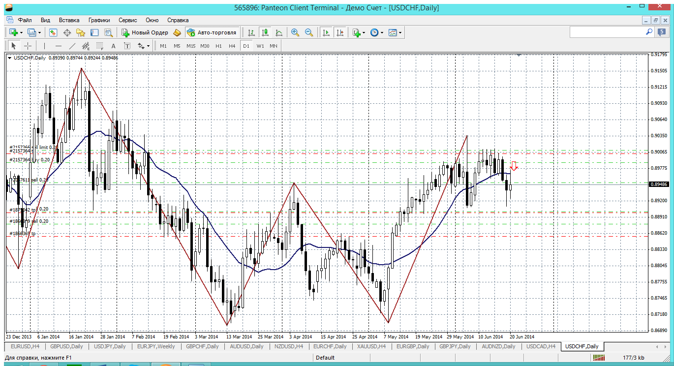 Далее доллар - франк. Здесь картина вроде как следующая получилась. Пара наконец то пробил и закрепился ниже мувинга на дневном ТФ. И хотя в пятницу была предпринята попытка вернуться выше, не получилось и сверху остался только хвост. Правда, тело свечи "бычье" и это несколько портит картину. Но все равно, думаю от 0.8968 (при возврате к пробитому мувингу) можно продать пару. Пипсов 40 вполне может получиться. Прикрепленные файлы: