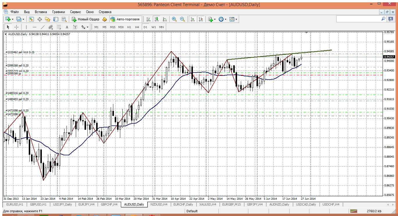 Многие ждут пробоя уровня 0.9445, чтобы покупать. Странно ??? Но ведь это максимумы 2014 года и по мне, так и ждать ни чего не надо. Так вот получился приличный уровень, который образовался после соединения максимумов мая и июня месяца.И в ближайшее время при тесте этой линии собираюсь австралийца продавать....получается из зоны 0.9450-0.9460 Прикрепленные файлы: