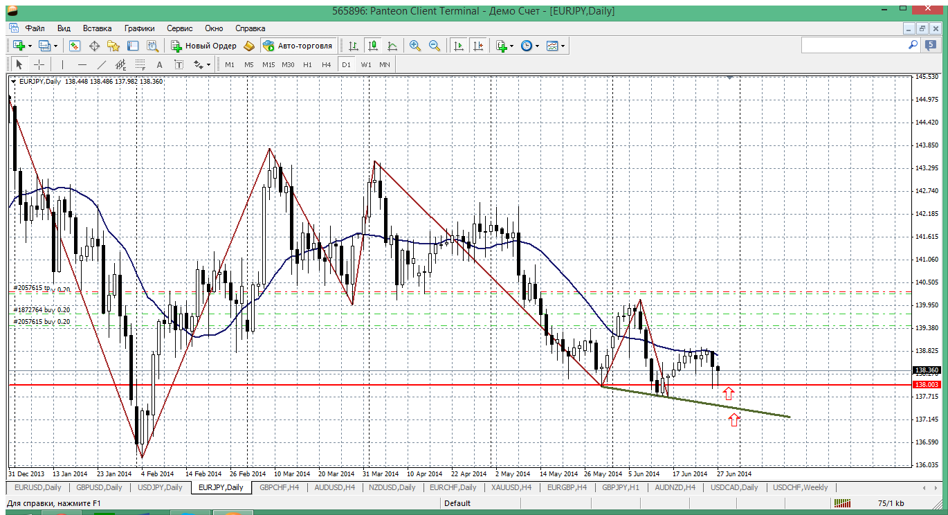 А по ЕВРО - ЙЕНЕ вот такой расклад получился. Пара, скорее всего, нащупала некое дно и вполне реально торговлю на ближайшую неделю вести с его использованием. И есть подозрение, что это дно проходит на уровне 138.00. Поэтому можно попробовать покупать от этого уровня. В тоже время, далеко ниже вроде как и не пойдут. Совсем рядом проходит дневная трендовая (примерно в зоне 137.45). Если что там покупки добавить можно... Прикрепленные файлы: