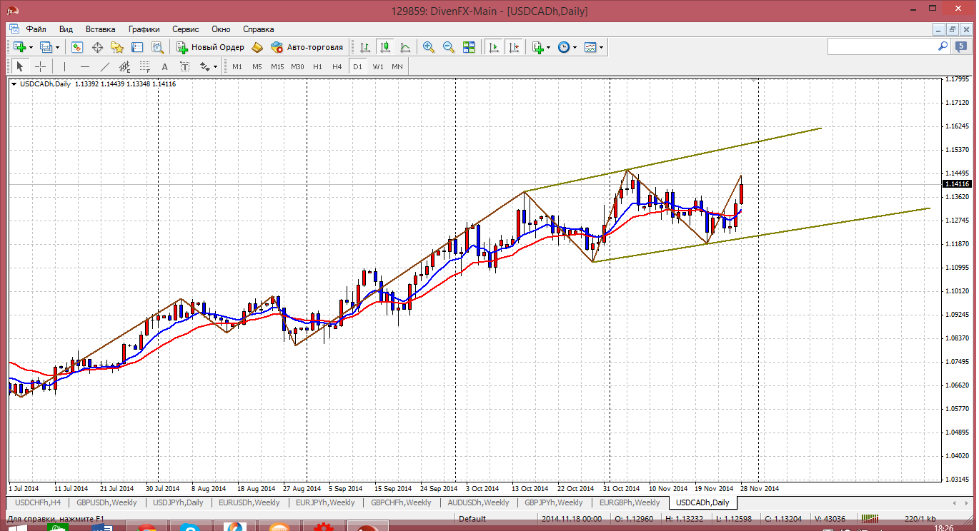 А вот эта пара, которую я недолюбливаю, но время от времени обращаю на неё внимание, демонстрирует уверенный рост. Причем с июле месяца рост был чуть ли не вертикальный, но с октября рост приобрел черты вменяемости и техничности. Цена на дневном ТФ образовала такой ровный восходящий канал и ходит между его границами. Сейчас месяц завершили выше мувинга и теперь можно не сомневаться, что цена направилась к верхней границе, а это у нас будет фигура 1.16. И такой рост, скорее всего будет, вон как нефть дешевеет.... Прикрепленные файлы: