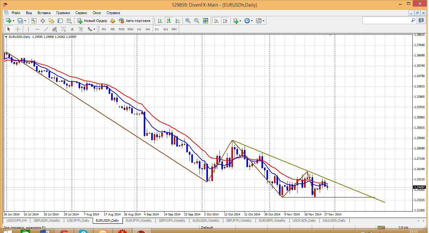 ЕВРА А вот эта пара уже явно потеряла силу импульса своего снижения. Глядя на дневку видим, как сужается её диапазон и уже что либо планировать именно по этому графику практически невозможно. До выхода из сформированного треугольника торговать стоит только внутри дня, с жесткими стопами. Выход может быть в любую сторону, причем может получится весьма стремительным. Не успеете среагировать.... Прикрепленные файлы: