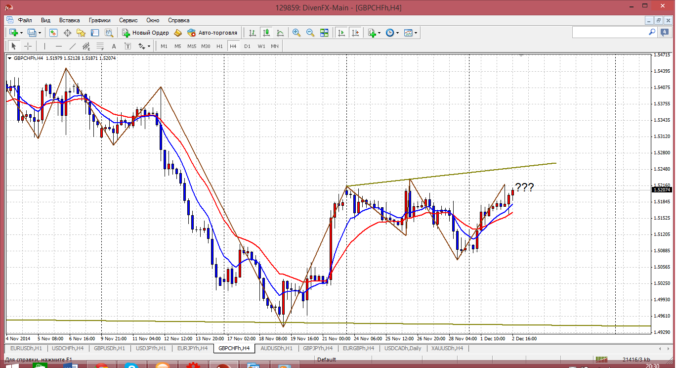 По паре сложилась неоднозначная ситуация: вчера очень прилично цена снизилась и пробила и закрепилась ниже мувинга на Н4 и вполне можно ожидать дальнейшего снижения. В таком случае при возврате цены к мувингу снизу, а в этой же зоне расположился сегодняшний мувинг - 1.5249. Вполне можно по этой цене продать. Но...в тоже время зиг-заг на этом ТФ не перерисован на снижение и по прежнему основное направление движения - в рост. Так что осторожно с объемом... Прикрепленные файлы: