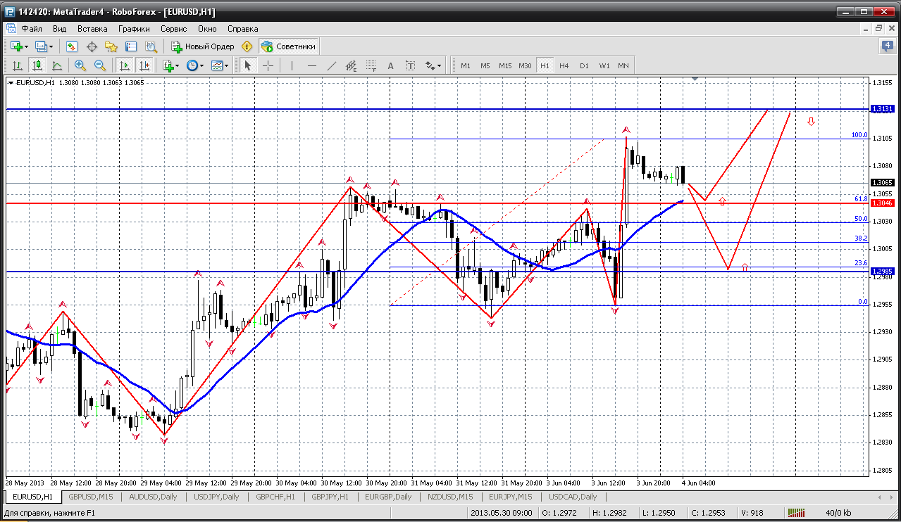 Евройена... пока в диапазоне: внизу 130.20, сверху 132...Это для торговли внутри дня - самый смак. А вот мысли на июнь месяц. Цена закрепилась дневными свечами ниже мувинга (18) и протыкает его только тенями, а закрытие дней последнюю неделю всегда ниже. То есть потенциал роста выдохся. На июнь месяц ожидаю приличного снижения: 1 цель - 128.15 (в чем я уверен сильно) и 2 цель - 126.40. Очень даже реальная. Прикрепленные файлы:
