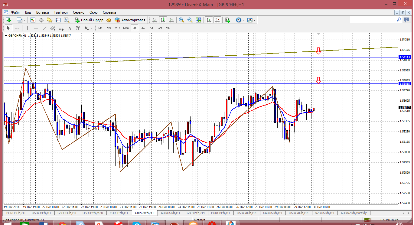 Ничего себе картину нарисовала пара в преддверии Нового года. Цена пробила и дневную трендовую (старую и сильную), пробила трендовую на часе (свежую и не менее серьезную) и вошла в фигуру 0.99. Этого многие ждали давно (те кто предпочитает торговать по тренду) и теперь вполне могут предложить покупки до следующего сильного уровня. Но считаю эти прорывы ложными и думаю, что можно продавать хоть с текущих значений - 0.9909 Прикрепленные файлы: