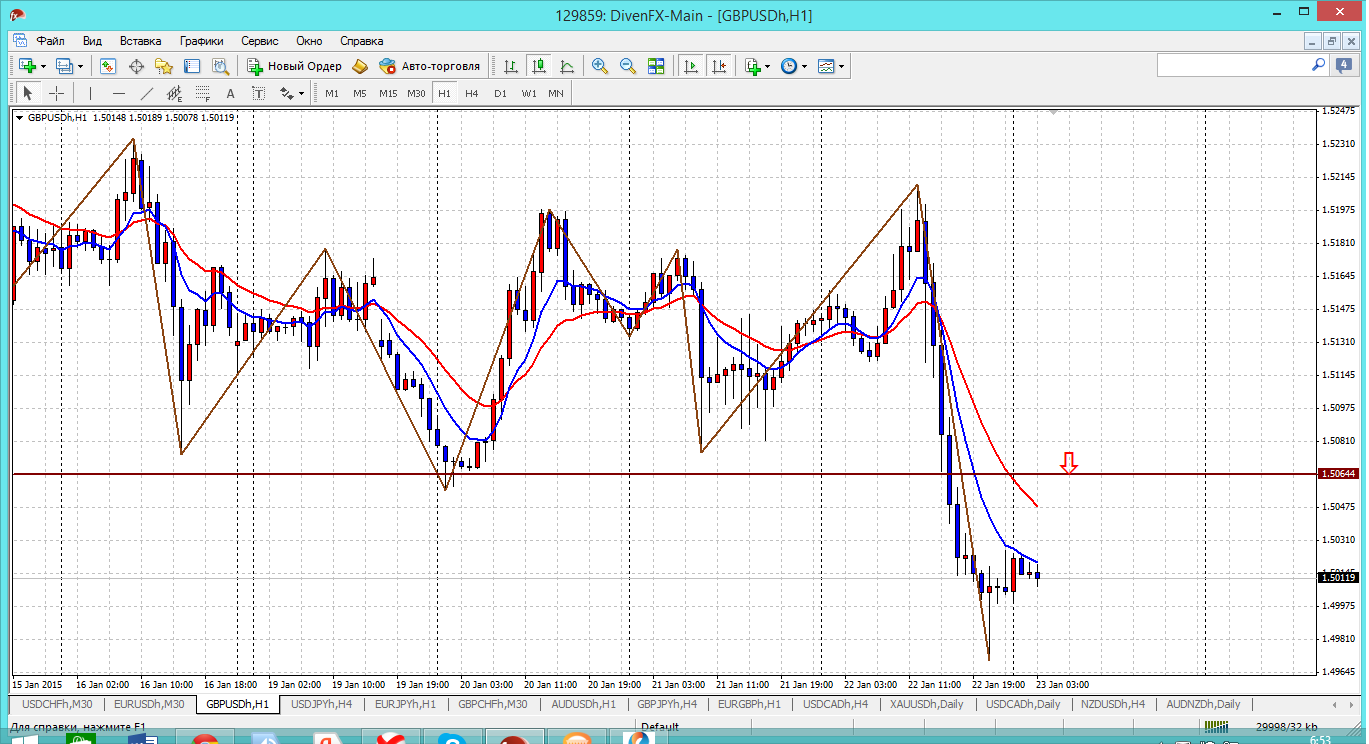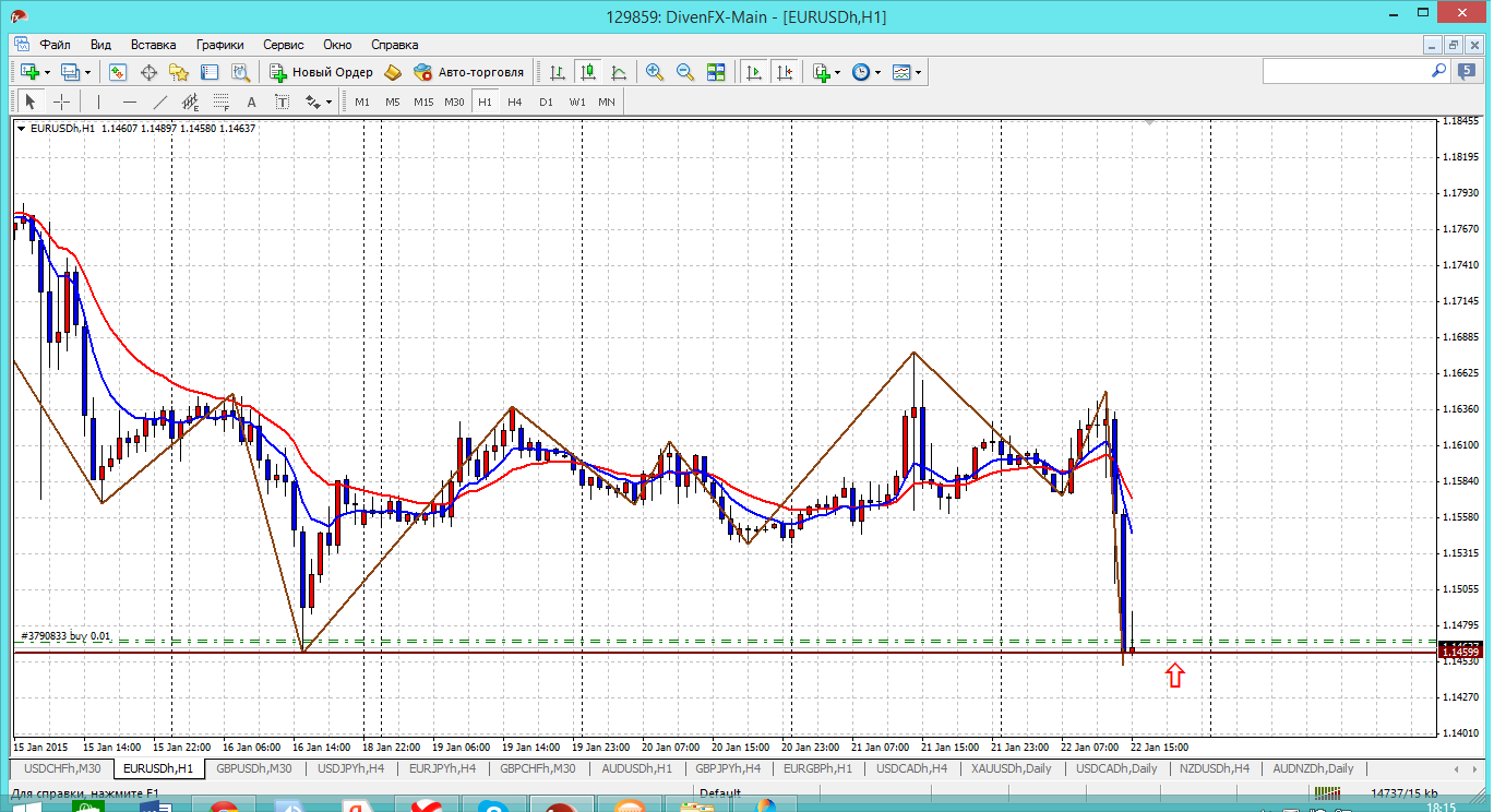 Конечно, по недельному графику вряд ли можно практически торговать или даже открывать позиции, но вот кое какие моменты очень ярко могут проявиться именно на нем. События с нац.бнком швейцарии...казалось цена грохнулась в никуда и не понятно почему остановилась там где остановилась??? А вот на недельном картина становится более менее понятной. Глянем на 2011 года. С января месяца идет практически одностороннее снижение пары. И только в районе 1.15-1.25 (это было в августе месяце) цена нащупала некое дно и уже от него начала рост в сторону 1.50. Вот и 15 января мы наблюдали обвал, казалось ничто не сможет его остановить. Но именно в этой зоне цена остановилась и пошла в небольшой рост. Поучается это у нас зона, ниже которой пару не пустят... Прикрепленные файлы: