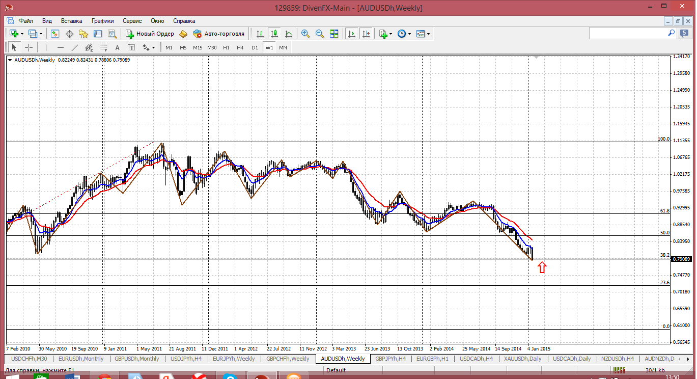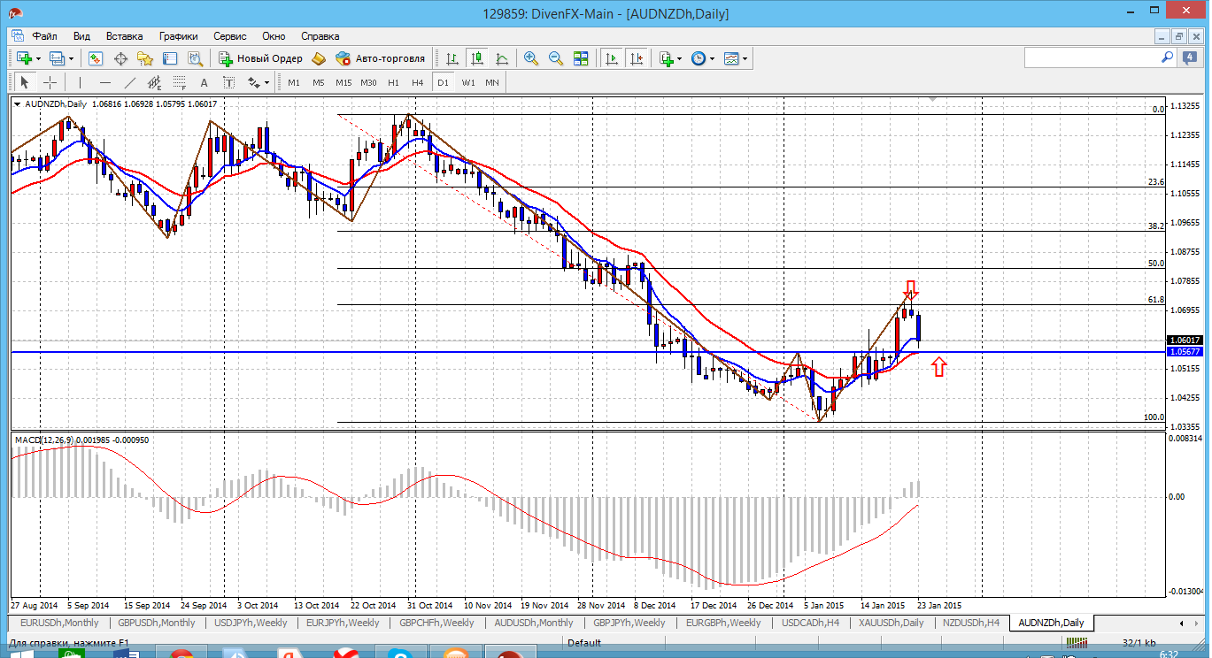 У этой паре на графике просто таки невероятный рост, который продолжался практически весь 2014 год от отметки 100.82 и закончился в фигуре 121, а вот какую нибудь мало мальски нормальную коррекцию так и е дождались. Цена зафлэтила в небольшом диапазоне (по меркам недельного ТФ). Но куда же без коррекции? Поэтому хоть к мувингу (на скрине красным цветом), хоть к первому значимому фибоуровню 38.2% - вроде как спустятся. Прикрепленные файлы: