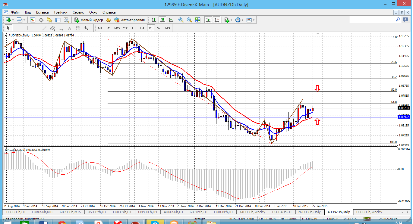 когда то эта пара была очень опасной: своей волатильностью и подвижностью. Сейчас же все с точностью до наоборот: пара поражает своим флэтом, который продолжается уже довольно длительное время. Сейчас цена находится между двумя важными уровнями: мувингом и фибоуровнем 38.2%. И расклад на мой взгляд получается следующий: если при тесте мувинга - покупку можно и нужно открывать. То вот уровень 38.2%, уже неоднократно тестирован, и не вызывает особой надежды на отскок. Поэтому для продаж нужно ждать теста 50%. Прикрепленные файлы: