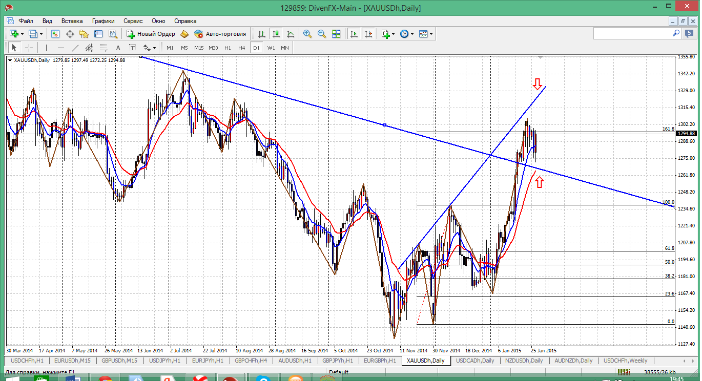 По золоту ситуация сложилась следующая. С одной стороны имеем завершенную формацию на 1 - 2 - 3 и это движение 3 достигло своих целей роста - уровень 161.8% по фиборасширению. Но вполне может оказаться, что цена пойдет на тест трендовой линии, а это произойдет в районе 1330 примерно. Но в обоих случаях покупать уже поздно, нужно рассматривать только возможности продать от серьезных уровней. Возврат к пробитой трендовой или даже мувингу очень даже вероятен. Прикрепленные файлы: