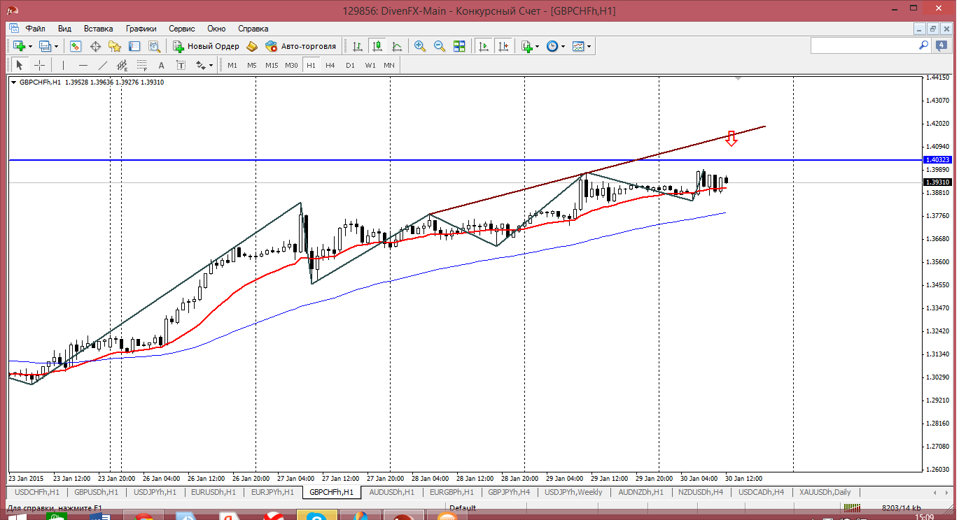 Хочется взглянуть на этот ТФ именно этой пары, но не для того чтобы попробовать проанализировать её и составить какой то план действий на ближайшую перспективу. А просто еще раз показать ту ситуацию, которая произошла с парой (да и с остальными франковыми) и из-за которой теперь эти пары практически не представляют интереса для торговли на рынке Форекс. Да и в целом подорван авторитет банка Швейцарии. Итак, диапазон ДФ за январь составил 2000 пипсов. Все бы ничего. Но то, что это движение произошло в течении нескольких часов. При этом ни в каких календарях не было никакой информации вообще о готовящемся заседании ЦБ хотя бы. Ничего...А это совсем не вяжется с нормальной, стабильной и постоянной торговлей... Прикрепленные файлы:
