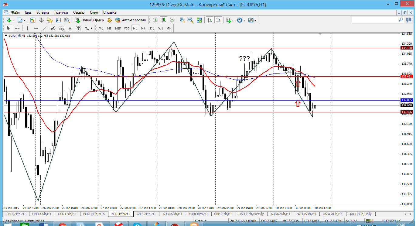А вот по этой паре сегодня потерпел полное фиаско... Ждал пару в рост, причем даже не предполагал, что ближайшая поддержка 132.80 будет протестирована. А её и протестировали, и пробили, и даже закрепились ниже (хорошо видно на Н1). И конечно, тут не главное. что то по ТА, тут во второй половине дня возобновили давление на евробакс. Так, скорее всего, и на ЕЙ...за компанию. Другого объяснения не нахожу. Прикрепленные файлы: