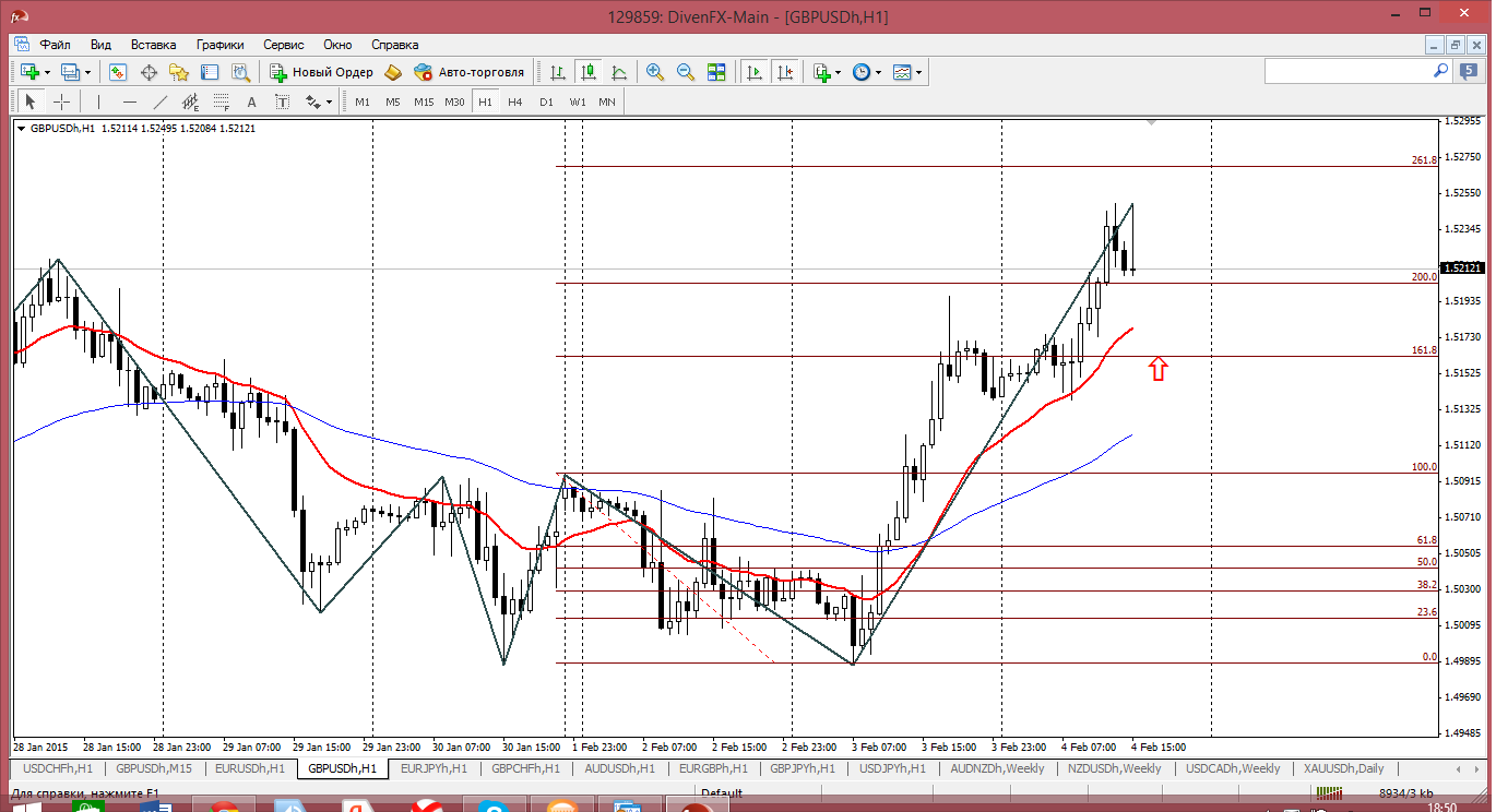 Уровень 1.50 пока остается непроходимым барьером на пути снижения пары. Вот и вчера, только только спустились чуть ниже (1.4987), так сразу цена полетела как стрела вверх и уже второй день остановиться не может. Хотя глядя на связку из последних 3-х свечей на Н1 вполне можно предположить о возможном снижении. Уж в фигуру 1.51 всяко вернемся (возврат к уровню 161.8% по фиборасширению). А там уже и купить по основному направлению можно будет. Прикрепленные файлы: