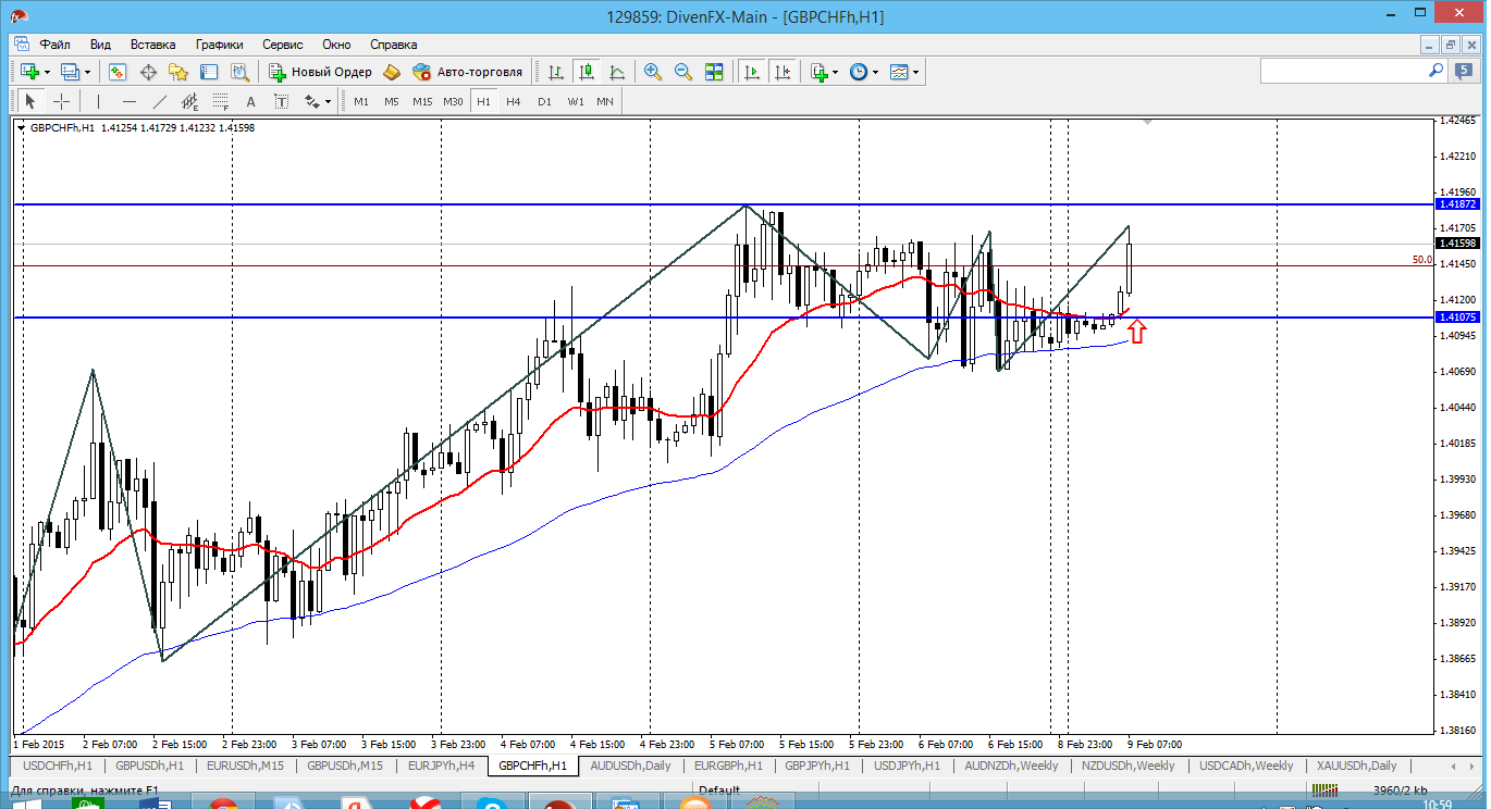 Что то действия швейцарского ЦБ возымели какое то непродолжительное действие на пару. Цена практически уже отыграла 50% потерь. И если совсем недавно уровень 1.40 был очень серьезным сопротивлением, от которого планировались продажи. Но продажи сработали всего один раз. Дальше цена закрепилась выше. Теперь сопротивлением выступает 50% уровень по фибо - это примерно 1.4140. Эта отметка пока что сдерживает рост и вполне можем увидеть откат либо к дневному мувингу - 1.3909 либо еще ниже, к 38.2% по фибо, а это 1.3804... Прикрепленные файлы:
