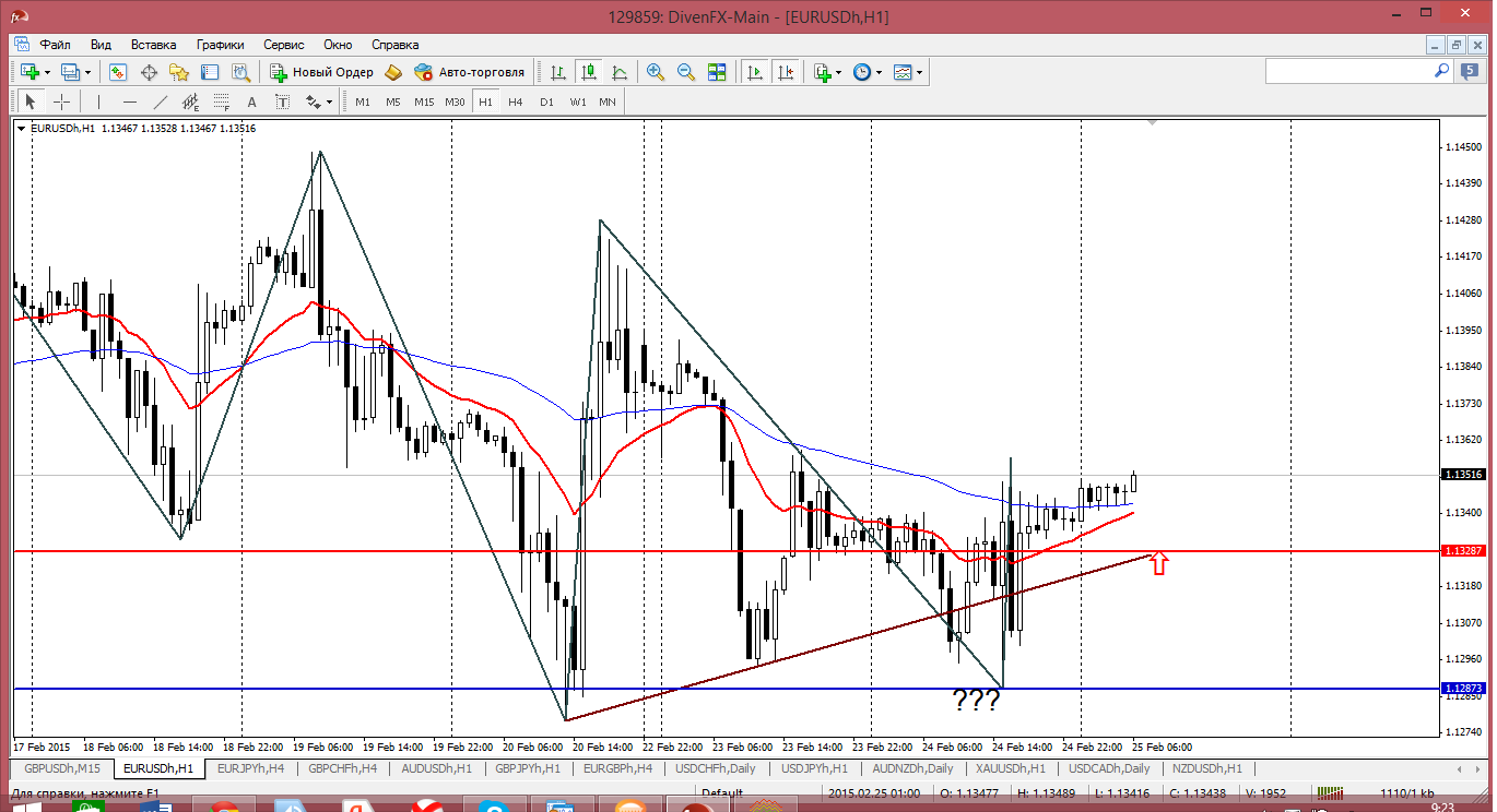 Ранним утром, взглянул на графки и вроде как получалось, что при подходе к уровню 1.13 пару можно планировать в покупки. Но вот сейчас, когда цену так и не пустили выше часового мувинга, когда цена пробиа и закрепилась ниже трендой, то уже к покупкам что то совсем иное отношение. И хоть совсем рядом первая поддержка внутри дня - 1.1287 - покупать от неё не хочется. Может на пробой через этот уровень попробовать поторговать? Прикрепленные файлы:
